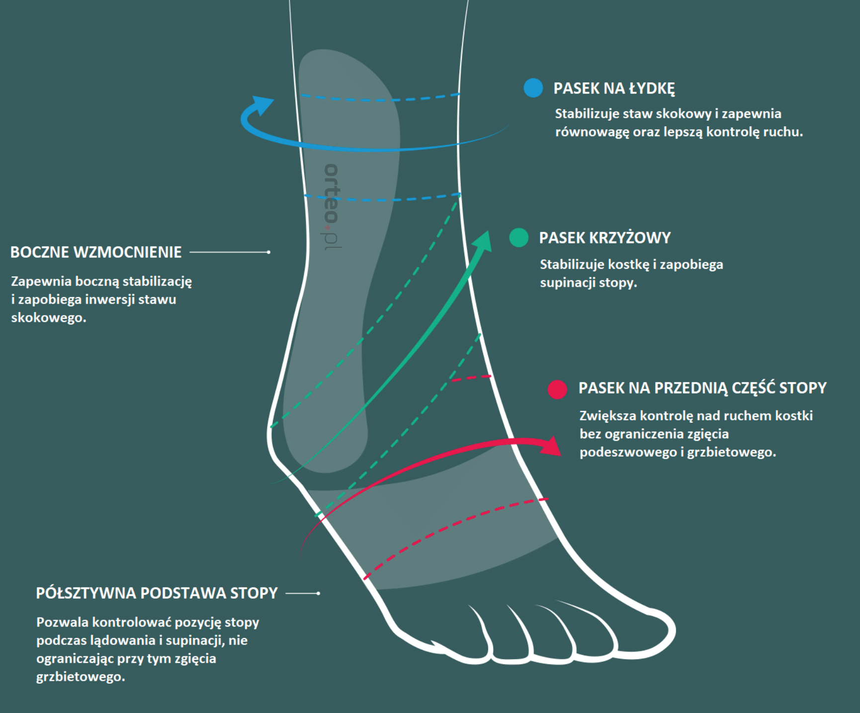 ActyFoot to innowacyjny stabilizator, który zapewnia wsparcie i częściowe ograniczenie ruchu stawu skokowego. Wykorzystywany jest przy ostrych zwichnięciach stawu, urazach więzadeł bocznych, ale też można go też stosować profilaktycznie w przypadku przewlekłej niestabilności kostki. Cechuje go smukła konstrukcja, dzięki której orteza bez problemu mieści się do obuwia. W dodatku jest lekki, a jego anatomicznie wyprofilowanie sprawia, że idealnie przylega do nogi, nie wywołując dyskomfortu w obrębie wrażliwych obszarów. Niski profil i cienkie paski gwarantują wysoki poziom komfortu podczas użytkowania. Przy tym jest niezwykle wytrzymały, a całkowicie rozpinana konstrukcja ułatwia bezpieczne zakładanie.